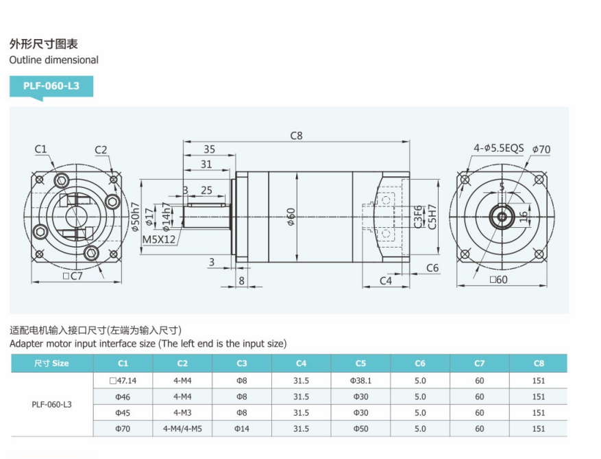 精密行星減速器PLF分別有60型號,80型號,90型號,120型號,減速比分別有L1,L2,L3段,可配各款無刷電機、伺服電機、步進電機。